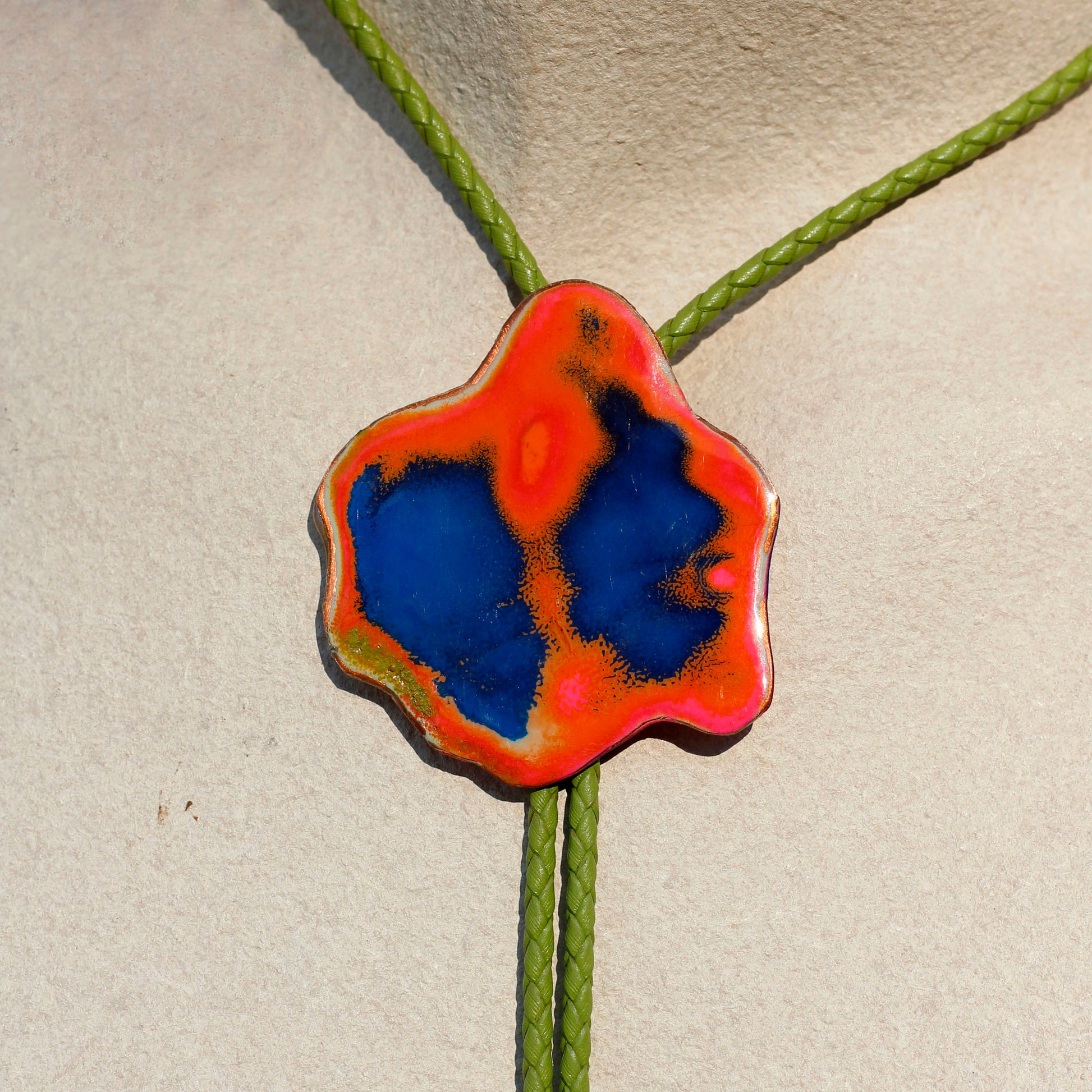 one of a kind bolo tie made of powder coated brass, braided green leather cord & gold plated bolo tips