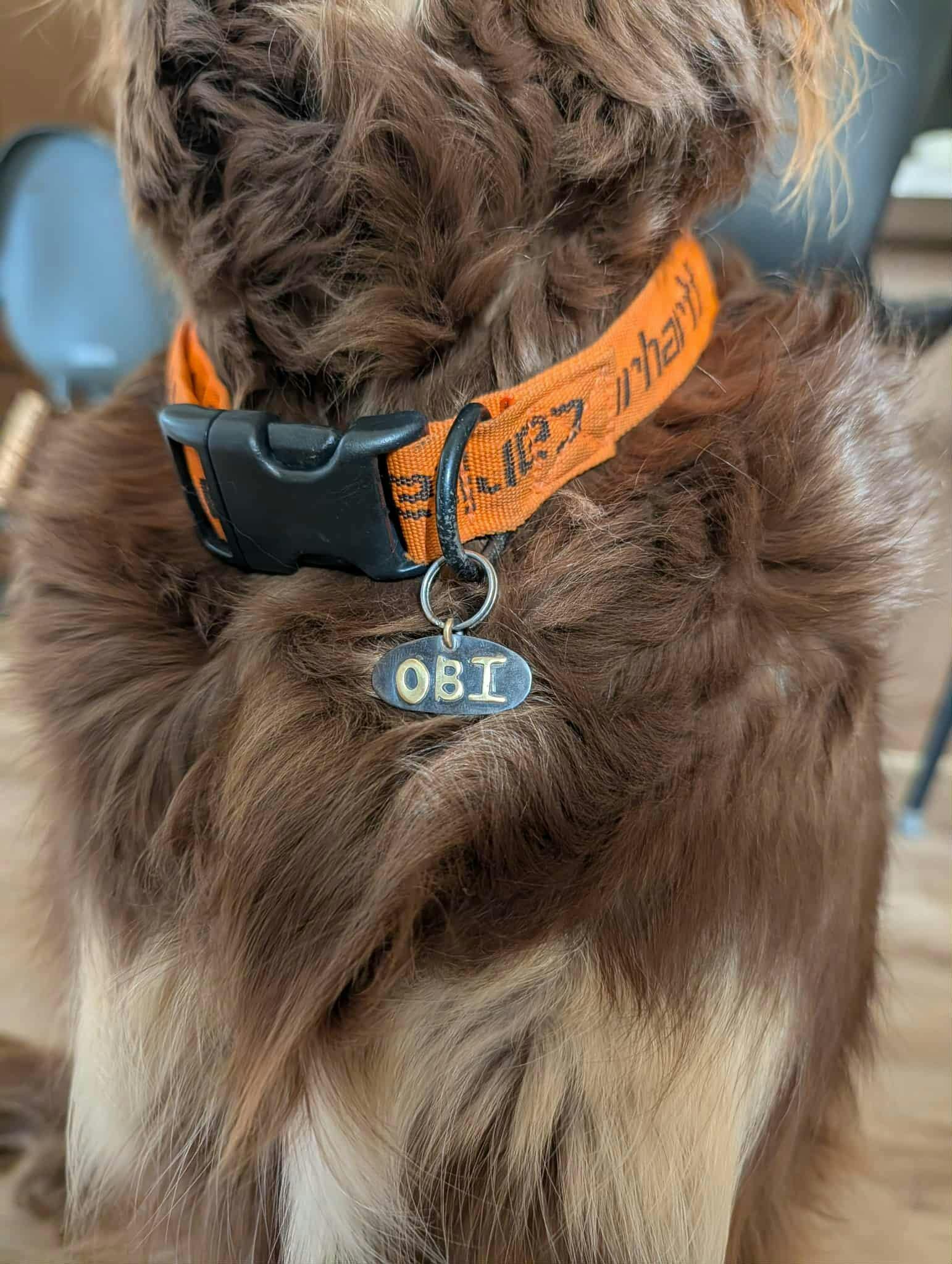 Your pet's name is delicately hand-pierced in brass and soldered onto darkened copper, with one or two stamped phone numbers on the back. A reinforced brass loop ensures that your furry friends can run wild without losing their precious name tag. Every pet deserves a fancy necklace!